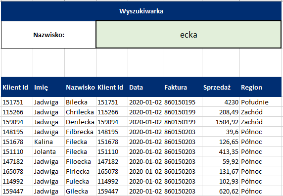 Przykładowo chciałby znaleźć osoby, które w swoim nazwisku mają „ecka”. Wpisuję i wyświetliły się te nazwiska. Teraz chciałbyś wyszukać pełne nazwisko. I też oczywiście ten formularz je znajdzie.